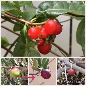 ⬆️ハニーサックルの実 ↙️今年もひとつだけ実ったオリーブ😅 ↘️去年植えて、お花咲かなかったな〜と思っていたら根元近くにひとつ実がついてたロシアンオリーブ😅😅