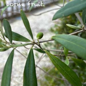 古株のオリーブの木 花いっぱい咲いて 1粒の実が付きました🫒 何十年経ったのかな 玄関の脇そこに居てくれる だけで良いのです♡