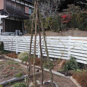 こんにちは😃 ようやくニュードーンの誘引が完了🌹 ベーサルシュートがたくさん出て3メートル近く 伸びているので山に真っ直ぐな木を切りに行って自然木のオベリスクを作ってみました😆オベリスクの高さも2メートル20センチと大きなものになりました😅 ニュードーンはあんまり枝更新をしないバラなので今ある枝を大切にしなきゃですね。