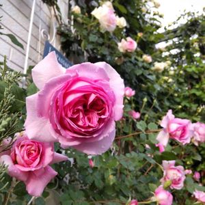 風が出てきましたね😃💦 バラがバサバサしております💦 ただいまの我が家のベランダ😁 奥から、マネ、マリーヌ、ルシエルブルー、シェラザード、ブルームーンストーン、パシュミナ、デスデモーナ、コフレ、ジャンティーユ、サイレントラブほかいろいろです😁ワカリズライケド😥 これからまだまだ咲くもようです😁 今年は通路をちゃんと確保してありますよ🎵 今のところですけど🙄