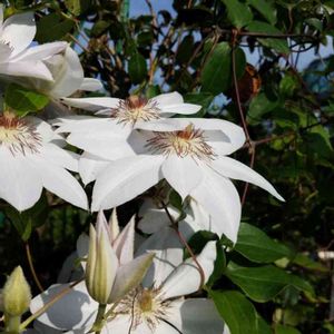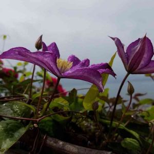 クレマチスNo.15 名前不明でしたが、昨年決まりました。「んべちゃん」ミモザさん命名です😉良かったわ✨スッキリ✨アーチの上。手を伸ばしてパチリ。☂️降ったりやんだり。