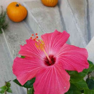 ハロウィーンカボチャ🎃オレンジに変わり始めました。 右下のオレンジ色の花は名前を思い出せません。こぼれ種からの💠です。