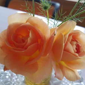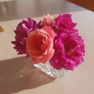 昨日、蕾だった🌹ハニーブーケを切ってコップに😊 開いた。まだまだ蕾がついているのだが、地植え初の越冬となる。
