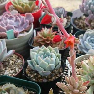 セダムじゃないよ!エケベリアだよ☝️ 木立になります。 花は赤一色で茎に直接付いてて、小さめです┏(ε:)” ペコリン