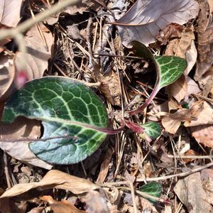 天狗山にて。 この小さい小さいシクラメンみたいな子の名前を教えて下さい🍀 葉っぱは大きくて2センチくらい。 草丈は5センチくらいしかないです。 フモトスミレでした。ありがとうございました😊