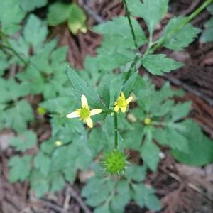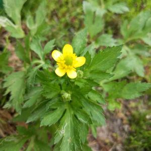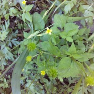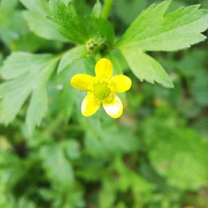 この花も小さくて限界。😅 いろいろ調べてみてキツネノボタン(狐の牡丹)のようです。 花終り実を決め手にしました。