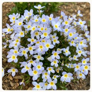 【雛草】《アカネ科》 花言葉 「甘い思い出」「寛大な愛」 「会える幸せ」「おとぎの国の夢」 和名 トキワナズナ ヒナソウの花は4枚の花びらで 十字のような形をしています。 一株でたくさんの花が密集するように咲くので、開花中は花の絨毯のようになります。 花は直径1㎝程度の小さな花ですが、葉は花よりもさらに小さなサイズをしています。 花色は薄紫色から白、水色があります。
