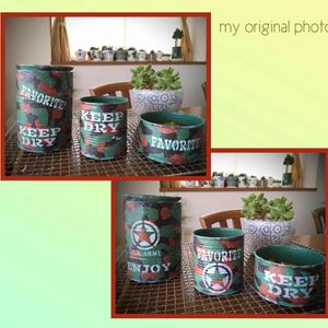 2月スタート 今月もよろしくお願いします💚 迷彩柄 ちょっと爽やか系で🎨 素焼き鉢(3.5号) コーン🌽缶 パイン🍍缶