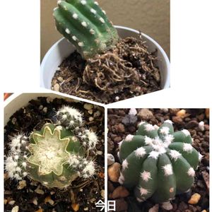 7月に投稿した100均のサボテン フォルモーサ...かなぁ...たぶん 根腐れでガッカリしながらも、もうダメ元でチョンパして放置していたら...... はいはい出ましたー‼︎ よかったね〜🤗✨✨ 上も下も助かりましたー‼︎ ちんこいからダメかと思ってましたが... よかったね〜🤗✨✨ このサボちゃん、あまりにも早い発根子出しの為、ホントに根腐れしてたのか?という疑いがかけられたましたが... 結果よかったんでね...うんうん よかったよかったと言いつつ、下の方は根が丸出しの今だに植え替えせずにそのまま放置〜‼︎ サボちゃんに口が無くってよかったよかった...😊 なんてね😉