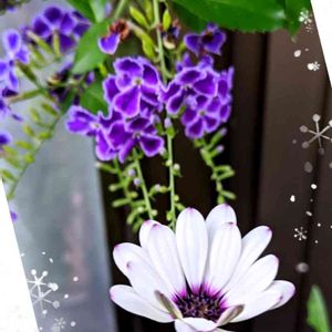 出会ってしまいました💕 垂れて咲くデュランタと 切り戻してまた咲き出した 植木鉢のディモルホセカ なんかムードある🤣♫