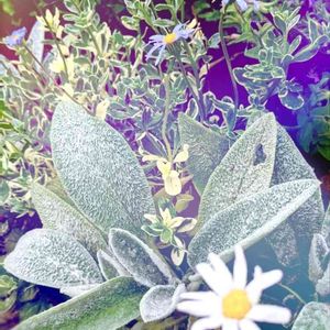 葉っぱの色も楽しめます 芝生との境目に長く植えた 🌿ブルーデージー2色と ラムズイヤー🌿