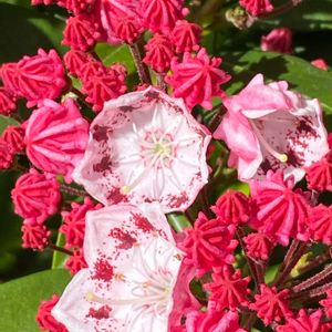 今年も会いに行ってきました❣️ カルミアはコンペイトウのような形をした、色濃い蕾を持っています。花が開くと皿形になり、色は薄く模様が入って、蕾の様子とは全く異なった印象を受けます。開いた花をよく見てみると、雄しべの先は花弁のくぼみの中に収まっています。この雄しべは、飛来した昆虫などによって刺激を受けると飛び出して、花粉も散るというおもしろい仕組みをもった花です。 まだ,咲き始めたばかり💓🎶💗