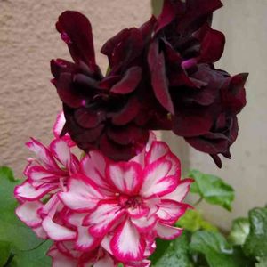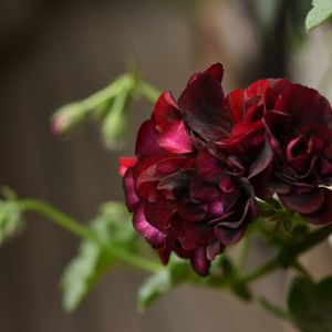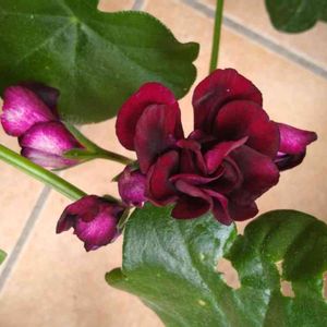 赤黒にすごく惹かれる。 八重咲きのアイビーゼラニウム、トムキャット。 ビロードのような質感、 クリムゾンレッドの花が満開になりました。 ちょっと花枝が長くなっちゃった。 日照不足なのかな~?