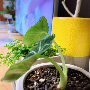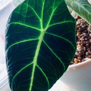 アロカシアブラックベルベット😊 光にかざすと、蛍光色の葉脈が幻想的です😊 多肉植物ばかり並べてると何処かに葉物が欲しくなっちゃいます😄