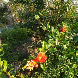 今ごろ、ザクロが花を咲かせています。もう実(左上に2個写っています)が熟し始めているというのに・・。