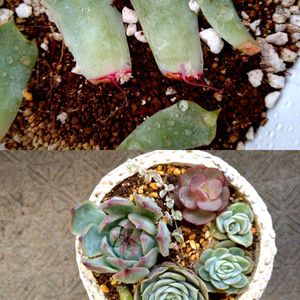 ㊤2021/09/23に仕立て直した時に取っておいた、桃太郎の初めての葉挿しが順調に育ってきました😊毎日見守っていましたが、今日ちょっとお水をあげてみました。 2枚挑戦して2枚とも上手く行きそうなのでもっと葉っぱ残しておけば良かったな😂 両端と下の葉っぱはシャルルローズ。桃太郎より少し前に葉挿ししてみたけど発芽せず…こっちはダメかな🤔 ㊦小さくなって一人だった桃太郎に先日の仲間を合流させました。みんな大きくなってね(◠‿・)