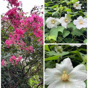 庭のピンクのサルスベリのお花が咲いていました(9/14日撮影)😊 お花が終わっているかなと思っていたので、まだ見れて嬉しい💗 フヨウの草丈が凄く高くなっていました。お花が可愛い🤍 2枚目 キバナコスモスも咲いています🧡 ヤツデ、ダイダイも成長しています。