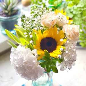 父の日のプレゼントに付いていたお花🌻 娘たちよ、きっとこれは母の為の花束だろうと汲み取る(笑) お陰で家の中が華やぎました✨
