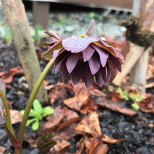 雨(雪交じり💦)上がりの朝の庭から🌦 地植えのクリスマスローズ第1号開花です🥰 あまり映えない色ですが🤎春の訪れ😊✨