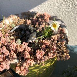 セダムの鉢に居候しています😊 こぼれ種のビオラさん🤍可愛く開花です😄💕 ワニさん🐊と一緒にパチリ📷✨