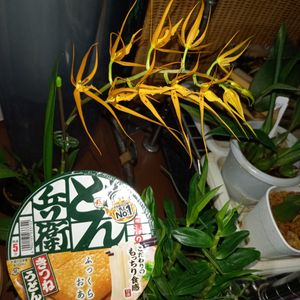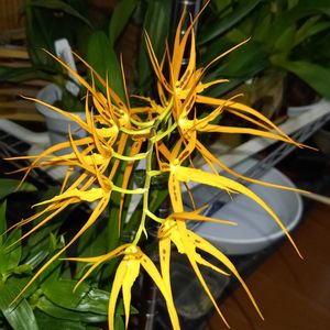 我が家のブラッシア✨ 2本目の花茎が咲き始めました🥰 咲き始めは黄色でどんどんオレンジになるなーとは思ってたけどこんなに色が変わっててびっくり‼️ 花茎が重くて写真撮ろうとしたらばたんと倒れた💦 そうしたら花びらがたくさん折れちゃってすごい惨事に😱 花びらがすごくもろくてまたびっくりでした💦