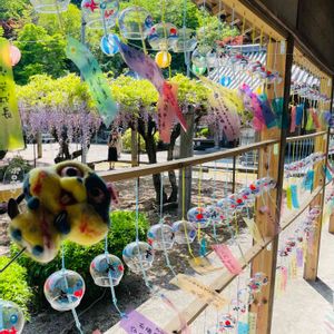 今日も石井町の藤の花💠 『童学寺』の境内は、 風鈴が風に吹かれて、 その奥に藤の花( ◉ ω ◉ ✿)/🎐 ☆入学祝いに💝ねずこ絵本📚Amazon⇒ amzn.to/2V8rn16