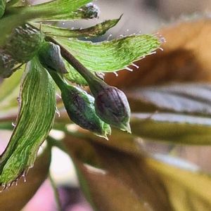 4/3介護施設の庭のお花たち ①②アオキの雌花🤎初めて見た👀 ツヤツヤのチョコレート色?アズキ色?エンジ色?が目立ちます 雄蕊がないので、雌花です アオキは雌雄異株 (アオキの雄花は、昨年2024年3/12に投稿) ③マンサクの木にも新芽(若葉) ④フジの花💜 雨粒つけて可愛い ⑤花穂がどんどん伸びてきました 左の方に藤の実もブラーンとぶら下がってます この実を見るとフジもマメ科🫛よね