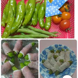 『早生ししとう』 レンジでチン‼️ 暑い日 はレンジで作ろう‼️ ししとうは荒い穴を開けておきます‼️必ず穴をあげてね👍 破裂の原因になりますから‼️ 薄切りの豚ロースを広げて軽く塩コショウをしてから巻き巻きします👍 耐熱皿に巻き終わりをしたにして並べます👍 間隔をあげてね👍 酒を大さじ1位かけてふんわりラップして 500wのレンジで4分チン✌️ あくまでもこの分量での時間ですよ👍 あら熱が取れたらお皿に取ります👍 今回は辛子醤油をつけて食べますがポン酢でも美味しいよ‼️ その他 好きなもので食べてみてね‼️