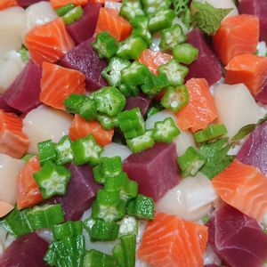 『青紫蘇』 【海鮮チラシ寿司】 ほんとうはもっと綺麗なものに 仕上げたかったのですが……… 奮発して鮪等を大きく切ってごまかしです(*≧∀≦) 🎋七夕なのでオクラを トッピングしました‼️ どうぞ召し上がれ〜〜〜✌️
