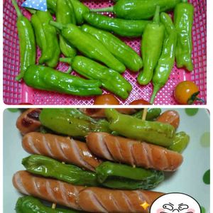 『早生ししとう』 串焼きにしました‼️ おつまみ⁉️ イイエ お昼御飯です‼️ 胡麻油で炒めて かるく塩コショウ✌️ 簡単だけれど見た目が良くないですか⁉️