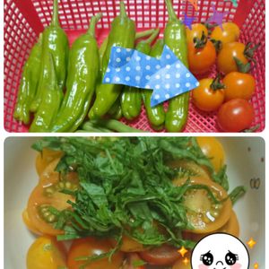 『ミニトマト』🍅 『青紫蘇』 初収穫のミニトマト🍅 そのまま食べても良かったのですが紫蘇の千切りと一緒に食べました‼️ 思ったより甘かったです‼️