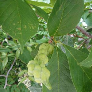 街路樹に実がついていました。 木蓮かこぶし? 花が咲いているところを見てないのでわかりませんが、街路樹なら木蓮でしょうか? あの清楚な花の実とは思えない形☹️