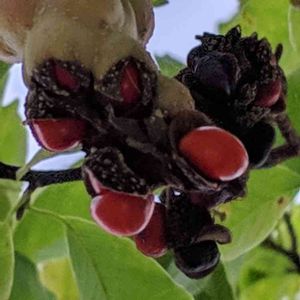 コブシの熟実。 殻を壊し赤い実が現れるようになった。
