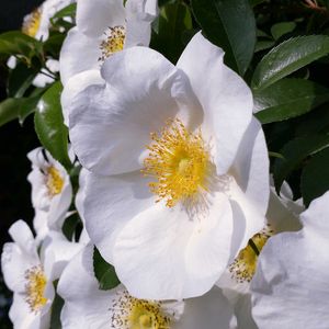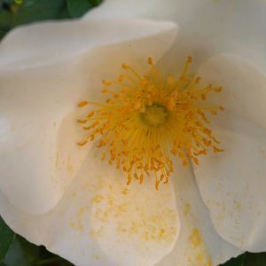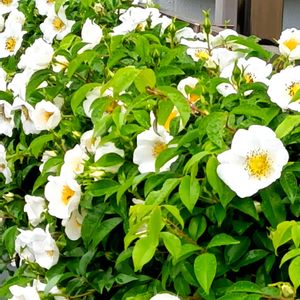 ナニワイバラ 散歩道で見つけた白い花の生け垣。 一重で真ん中の蕊が黄色の可憐なお花ですが、もう蕊が茶色くなって散りそうなお花もありますし、蕾も有りました🍀