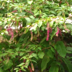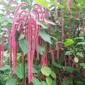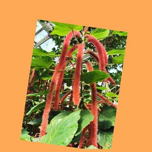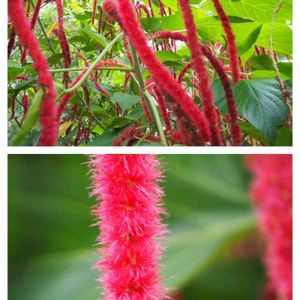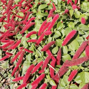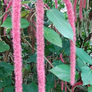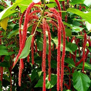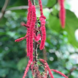 「ベニヒモノキ」は、赤い花穂が垂れ下がっている姿が赤い紐のように見えることから。直立し、下部からよく分枝する。葉は暗緑色の先が尖った卵形で、鋸歯があり、互生する。原産地では周年、葉腋から長い紐状の穂状花序を出し、下垂させる。花弁は無く、萼と雄しべだけがある。