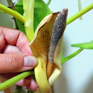 先日見つけたフィロデンドロン・マレービューティーのつぼみのようなものが、花が咲くのを見る前に枯れてきたので、中を開いてみたらサトイモ科の花と同じ形をしていて、やはり花だったようです。 いつ咲いたんだろう?そもそも咲いたのかな?見たかったなあ…。今の姿はとてもきれいとは言えませんがどんな花だったんだろう。花が咲くのは珍しいようなので、とても気になります。 透明な液がいっぱい出ていて、触るとベタベタします。