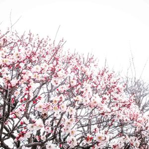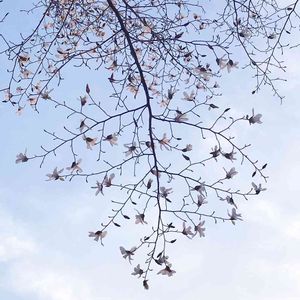 曇り空にピンク色の花。 コブシ…シデコブシかな?