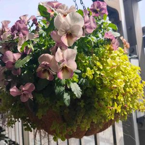 ビオラのハンギング、セダムに侵食されてきた😂セダムバスケットみたいでこれはこれでカワイイ💚 パンビオさんたち、だいぶ徒長&強風で乱れてきてますが、まだまだキレイに咲いてます☺️