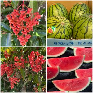 今年のスイカは大成功🍉 一番大きいのはなんと 11.2㎏もありました😆🍉 猛暑のおかげで甘い❤️ めちゃめちゃ甘い🍉 畑で放任栽培ですが 1本から 超大玉2個 大玉4個 中小玉5個(まだ生長中)です🌿 小さいスイカは 難易度の高い スイカ割りに使いました😆🎶 なかなか当たらなくて 子どもたちの手がビリビリ🤣 楽しい夏の思い出😆🍉 暑さが続きますが のどが渇いたら スイカ飲む生活です😆🍉 左の写真のスイカの奥の2個は メロンのころたん🍈 こちらも15個ほど 実っています🍈 右上の写真の手前の くろこだまちゃん コンパクトに栽培できて 中玉サイズ 収穫数は少な目ですが こちらもあま〜い🍉 スイカ祭り開催中の 我が家です🥳🍉