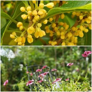 ☁️/☂️の予報なんですが、めっちゃ晴れててめっちゃ暑いデス☀️😵💦 だけどお庭では秋の香りが漂っています。キンモクセイの甘~い香り💛 グレープセンセーションの奥に見えてるのがキンモクセイです。一昨年に強剪定して昨年はあまり剪定しなかったので花の数がスゴいです😲 お庭に出ると甘い香り。この幸せはもう少し続いてくれそうです😊