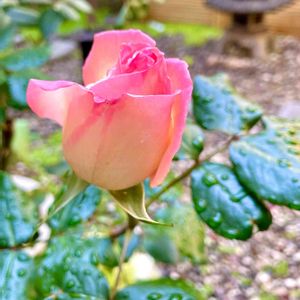 雨上がりの我が家石庭ボーダー😄 🌹プリンセス ドゥ モナコ🇲🇨さんは、石庭海を越えて、遥か日本を眺めて🇯🇵🗾いるようです♪ 和洋折衷ではなく、それぞれ独立した中の、ほっこりショット☺️ いい場所に咲いてくれて、ありがとう🥰