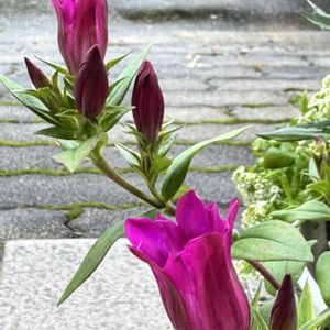 1日雨でした☔ ①②軒下のリンドウさん開いて来ました ③ハイビスカスさん この頃は4日くらい咲いてくれています ④アイビーゼラニウムさん ⑤濡れて重さで枝垂れた薔薇さん 明日は晴れるかな?