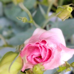 おはようございます♪ 雨が降ってます☔ とっても涼しいです♪ ①いつものバラ🌹 ②③富貴蘭淀の松、モリモリ株が増えるので鉢から出して木につけました。小さな方に蕾ができてました❣️ 3年目、とっても嬉しい😊 ④⑤翡翠、葉っぱが日焼けしてしまいましたが、蕾が沢山出てます✌️ この花の色大好きです❤️