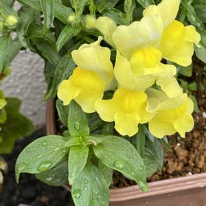 黄色のキンギョソウ🟡 花の下から違う葉っぱ🌱が? キンギョソウよりちょっと広い葉っぱだよね? でもキンギョソウっぽい?