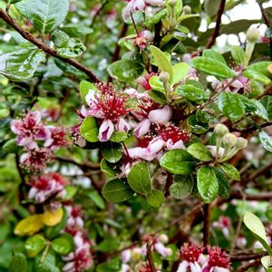 🏷️あっ火曜日 赤い蕊が素敵なフェイジョアが満開でした♪ 近くの商業施設の駐車場なんですが、フェイジョアがあるなんて知らなかった! こんなに咲いたら、実もいっぱい出来るかな。見てみたい👀💕