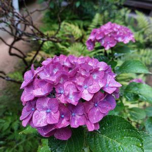 梅雨本番に入りました〜☔️ アジサイ色々です💜🩷🩵💙 雨の中 イチョウの葉っぱの上にも水滴が💧💧💧🍃