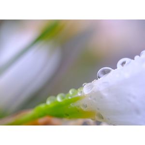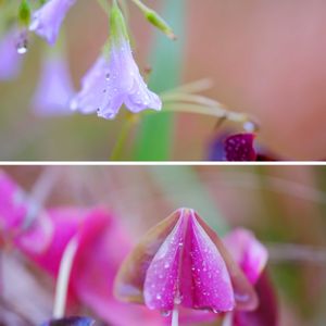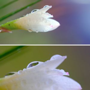 土曜の朝の撮影です。 タマスダレに水玉です。 花弁の先端のピンクの部分についた水滴がその色を映しています。