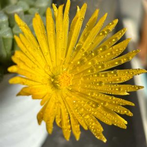 🟨フェネストラリア 五十鈴玉錦🟩 少しだけ斑入りの株ですが、今回は花の写真です。 冬型多肉植物の五十鈴玉は、おかしな形の葉っぱからは想像つかない、普通に綺麗な花が咲きます。 タンポポのように、昼頃に開花して夕方にはすぐしぼんでしまうようです。 五十鈴玉のそっくりさんに群玉という多肉植物がいますが、花の色で見分けられるそうです。五十鈴玉は写真の黄色で、群玉は白色らしいです。 色々な多肉植物を育てていますが、どうしても五十鈴玉は育てるのが苦手で、過去に何度も枯らしてきたのですが、今回初めて夏越しからの開花までくることができました。 鉢の置き場所をより風通しの良い場所にして、水を少なすぎず多すぎずうまいことやるようにすると、猛暑でもギリギリ夏越しできるようです。 冬越しも頑張ります!