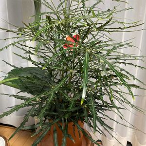 今日のお花 アラレア 艶々の細長いギザギザの葉っぱ オシャレなカフェの窓際にありました。 2024.10撮影