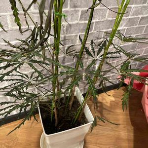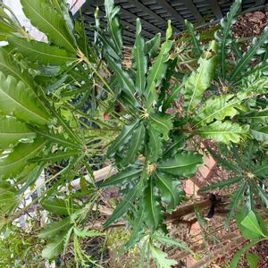 おはようございます😃 庭のお掃除の時、壁側にこんなに大きくなった観葉植物がいました。 例によって小さい苗木を植えたと思いますが、こんなに大きくなると名前わからないです。2m近くありますが…。 どうか、この子の名前お分かりの方、教えて下さい。 お願いします。